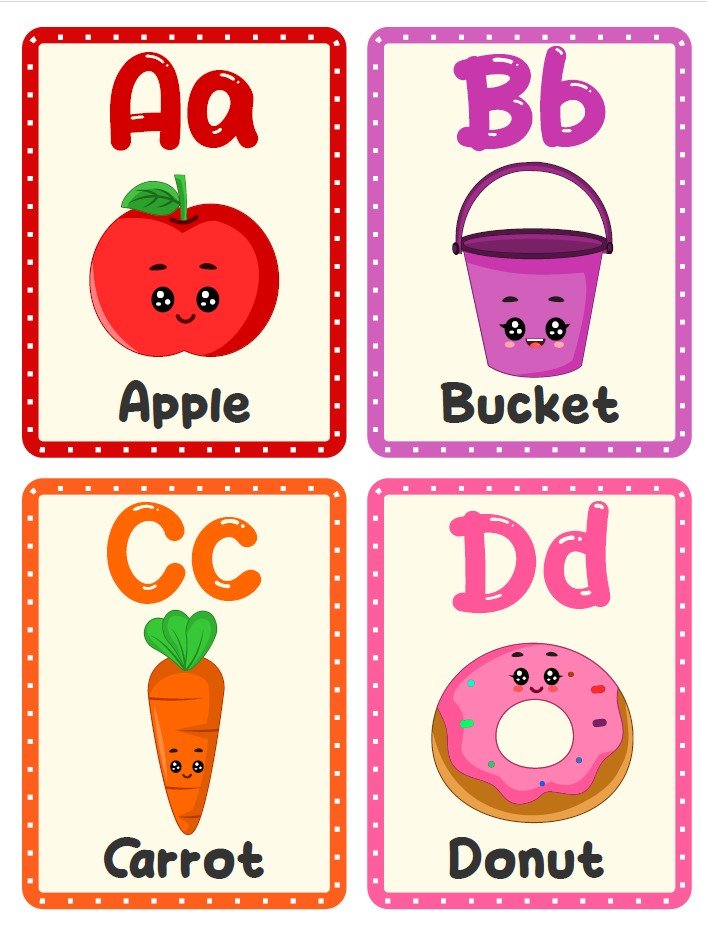 Setiap flashcard menampilkan huruf besar dan kecil (Aa, Bb, Cc, dan seterusnya) yang dipadukan dengan gambar lucu dan berwarna cerah, seperti apple, bucket, carrot, donut, frog, hingga helicopter. Ilustrasi bergaya imut membantu anak lebih cepat mengingat huruf sekaligus kosakata sederhana dalam bahasa Inggris.